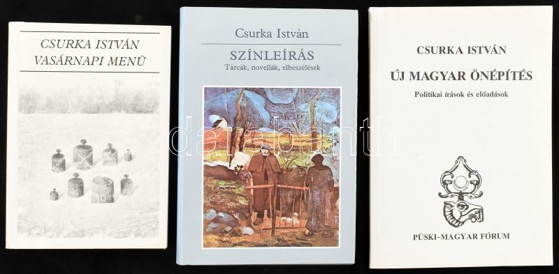 Csurka István 3 műve: Színleírás, Vasárnapi menü, Új magyar önépítés. Bp.,1984-1991,Magvető - Püski - Magyar Fórum. Kiadói egészvászon-kötés, kiadói papír védőborítóban, és kiadói papírkötések