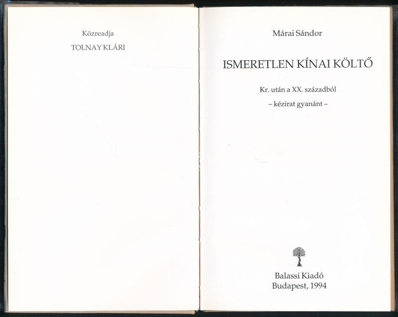 Márai Sándor: Ismeretlen kínai költő. (Kr. után a XX. századból - kézirat gyanánt.) Bp., 1994. Balassi, 52 p. Egésztáblás színes képekkel illusztrált! Kiadói bársonykötésben. Ritka!