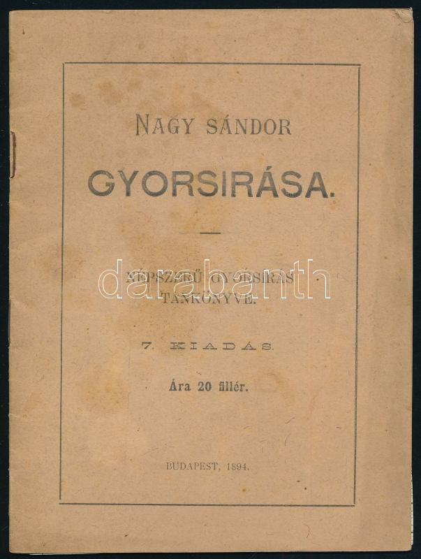 Nagy Sándor gyorsírása. Népszerű gyorsírás tankönyve. Bp., 1894. Kiadó... https://www.darabanth.com/de/428-Fernauktion/428.0/Bucher/Bucher-Andere-kuriositaten~1000026/Nagy-Sandor-gyorsirasa-Nepszeru-gyorsiras-tankonyve-Bp-1894-Kiadoi-papirkotes~II2746896