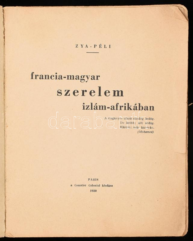 Zya-Péli: Francia-magyar szerelem Izlám-Adrikában. Paris, 1930, Courri... https://www.darabanth.com/de/428-Fernauktion/428.0/Bucher/Bucher-Andere-kuriositaten~1000026/Zya-Peli-Francia-magyar-szerelem-Izlam-Adrikaban-Paris-1930-Courrier-Colonial-Kiadoi-papir~II2741547