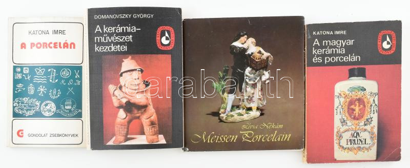 4 db könyv - Katona Imre: A porcelán, Domanovszky: A kerámiaművészet kezdetei; Katona: A magyar kerámia és porcelán; Nékám: Meissen Porcelain. Kötetenként változó kötésben, jó állapotban