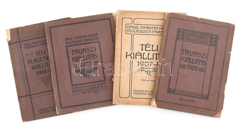 Országos Magyar KépzÅ‘művészeti Társulat 4 kiállÃtási katalógus: Téli nemzetközi kiállÃtás 1906-7, Téli kiállÃtás 1907-8, Tavaszi kiállÃtás 1908, Tavaszi kiállÃtás 1909. Bp., én., Singer és Wolfner. Kiadói papÃrkötés, a borÃtók sérültek, kettÅ‘ hátsó borÃtója hiányzik.