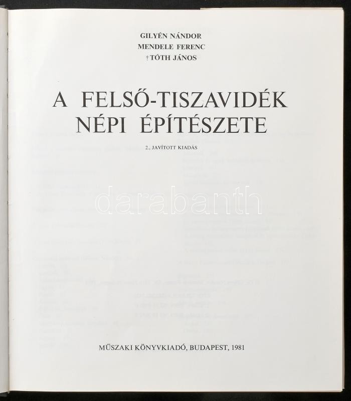 Tóth János: Az őrségek népi építészete. Bp., 1971, Műszaki Könyvkiadó. Fekete-fehér képekkel gazdagon illusztrálva. Kiadói egészvászon-kötés. Megjelent 1700 példányban. + Gilyén Nándor, Mendele Ferenc, Tóth János: A Felső-Tiszavidék népi építészete. Bp., 1981, Műszaki Könyvkiadó. Második kiadás. Fekete-fehér képekkel illusztrált. Kiadói egészvászon-kötés, kiadói papír védőborítóban.
