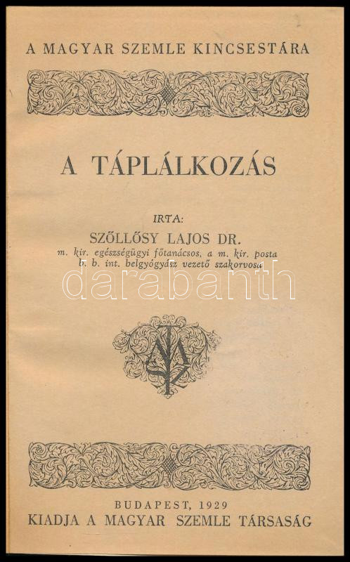 Dr. Szőllősy Lajos: A táplálkozás. A Magyar Szemle Kincsestára. Bp., 1929, Magyar Szemle Társaság, 79+(1) p. Átkötött egészvászon-kötésben, kissé foltos borítóval.