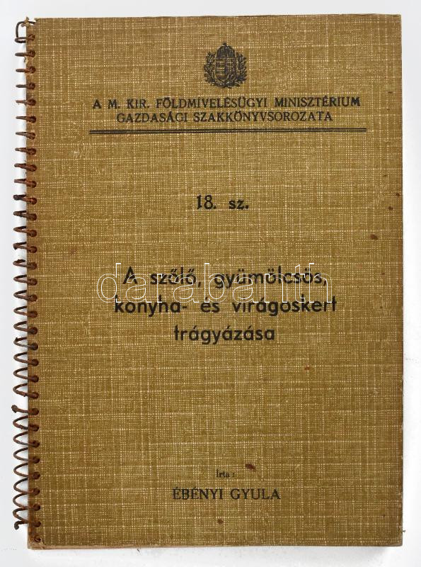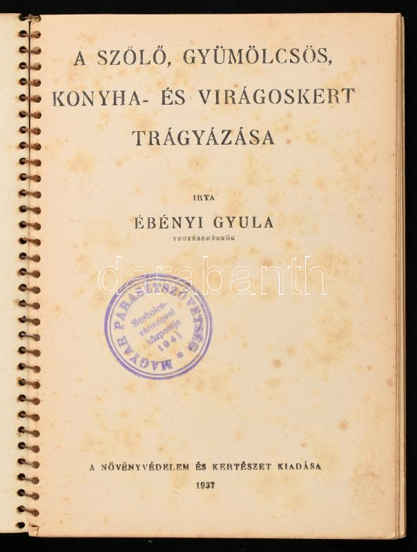 Ébényi Gyula: A szőlő, gyümölcsös, konyha és virágoskert trágyázása. Bp.,1938, Növényvédelem és Kertészet. Kiadói kissé sérült spirál-kötés, kissé foltos borítóval, foltos címlapon intézményi bélyegzővel, helyenként kissé foltos lapokkal.