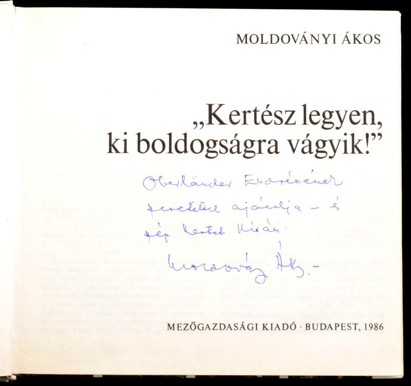 Moldoványi Ákos: "Kertész legyen, ki boldogságra vágyik!" DE... https://www.darabanth.com/de/428-Fernauktion/428.0/Bucher/Bucher-Gastronomie-und-Gartnerei~1000013/Moldovanyi-Akos-Kertesz-legyen-ki-boldogsagra-vagyik-DEDIKALT-Bp-1986-Mezogazdasagi~II2742850