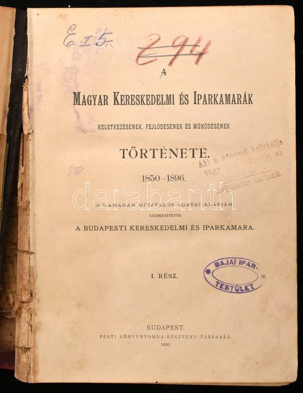 [Fritz Péter]: A Magyar Kereskedelmi és Iparkamarák keletkezésének, fejlődésének és működésének története. 1850-1896. I. rész. A kamarák hivatalos adatai alapján szerkesztette a Budapesti Kereskedelmi és Iparkamara. Unicus! Több kötete nem jelent meg. Bp., 1896.. Pesti Könyvnyomda-Rt.,326+226 (Függelék)+III p. Átkötött félvászon-kötésben, kopott, foltos borítóval, sérült kötéssel, pár kijáró lappal, intézményi bélyegzésekkel, megviselt állapotban.