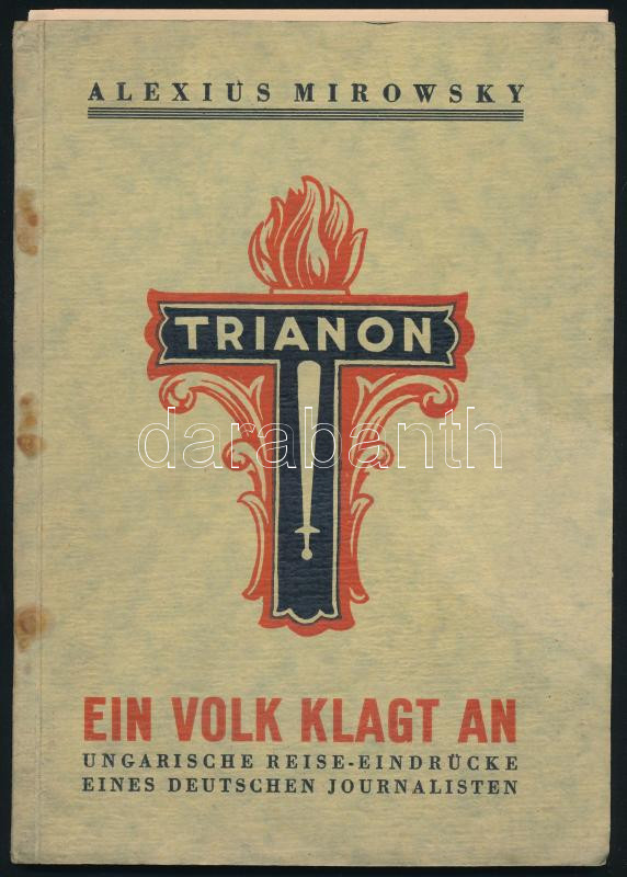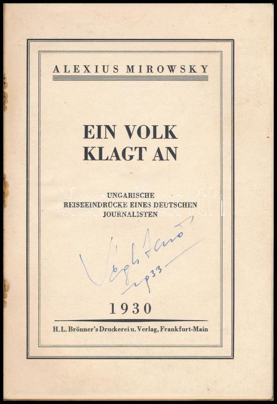 Mirowsky, Alexius: Ein Volk Klagt An. Frankfurt-Main, 1930, H.L. Brönner's Druckerei u. Verlag, 48 p. Német nyelven. Kiadói illusztrált papÃrkötés, kissé foltos, szétvált tűzéssel, néhány kijáró lappal. IsmertetÅ‘ és korrajz az 1920-as évek végének Magyarországáról (Trianon következményeinek fényében), egy német újságÃró által leÃrva, ahogyan Å‘ látta és tapasztalta.
