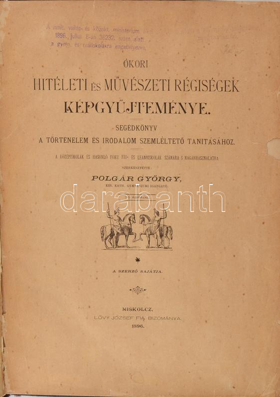 Ókori hitéleti és művészeti régiségek képgyüjteménye. Segédkönyv a történelem és irodalom szemléltető taníiásához. A középiskolás és hasonló foku fiu- és leányiskolák számára s magánhasználatra. Szerk Polgár György. 715 ábrával. Miskolcz, 1896. Lővy József, V+206 p. 26. oldaltól gazdag képanyaggal illusztrálva. Korabeli, sérült gerincű eglszvászon kötés