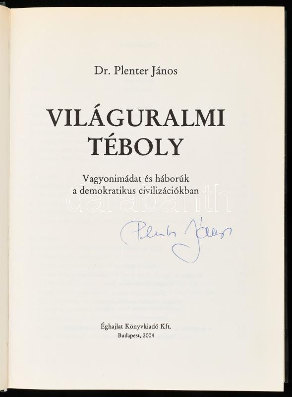 Plenter János: Világuralmi téboly. Vagyonimádat és háborúk a demokratikus civilizációkban. A szerző által ALÁÍRT példány. Bp., 2004., Éghajlat. Kiadói kartonált papírkötésben.