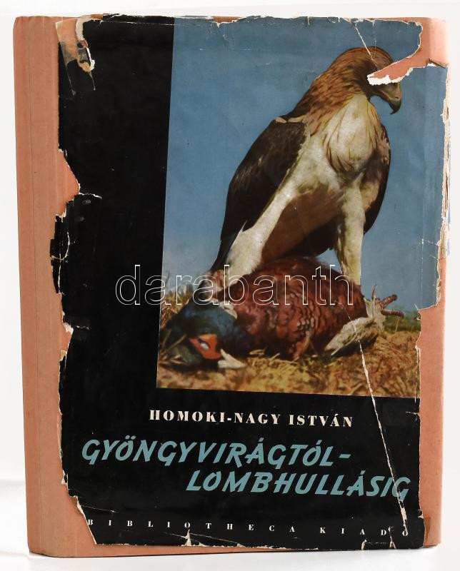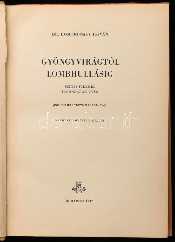 Homoki-Nagy István: Gyöngyvirágtól lombhullásig. Színes filmmel vadmadarak után. Bp., 1957, Bibliotheca. Második kiadás. Fekete-fehér és színes fotókkal illusztrált. Kiadói félvászon-kötés, tulajdonosi bejegyzéssel, erősen hiányos kiadói papír védőborítóval.