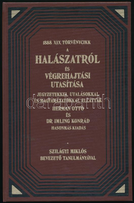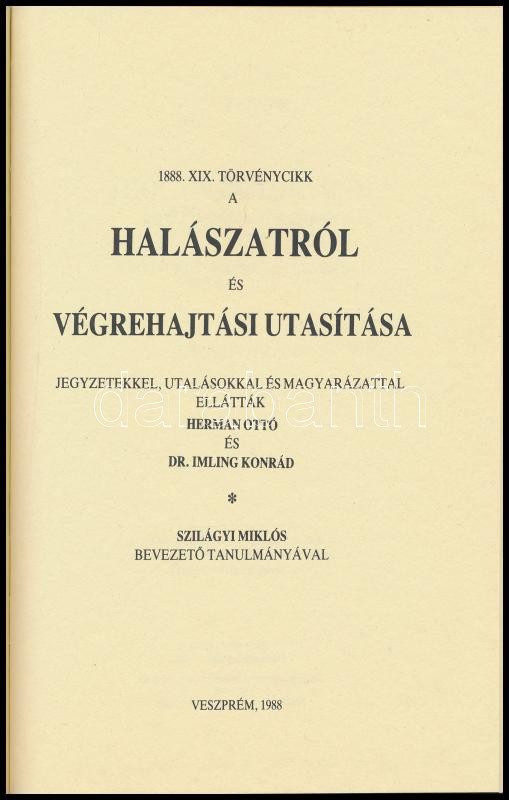 1888. XIX. törvénycikk a halászatról és végrehajtási utasítása. Jegyzetekkel, utalásokkal és magyarázattal ellátták: Herman Ottó és Dr. Imling Konrád. Szilágyi Miklós bevezető tanulmányával. Szerk.: László Péter. Veszprém, 1988, Pannon-ny., 111 p. Reprint kiadás. Kiadói kartonált papírkötés, jó állapotban.