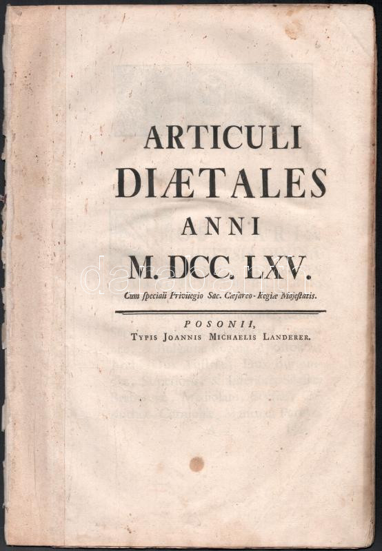 Articuli diaetales Posonienses anni M.DCC.LXV. Posonii, é. n. Landerer... https://www.darabanth.com/de/428-Fernauktion/428.0/Bucher/Bucher-Jura~1000008/Articuli-diaetales-Posonienses-anni-MDCCLXV-Posonii-e-n-Landerer-40l-Az-1765-o-orszaggyu~II2743834