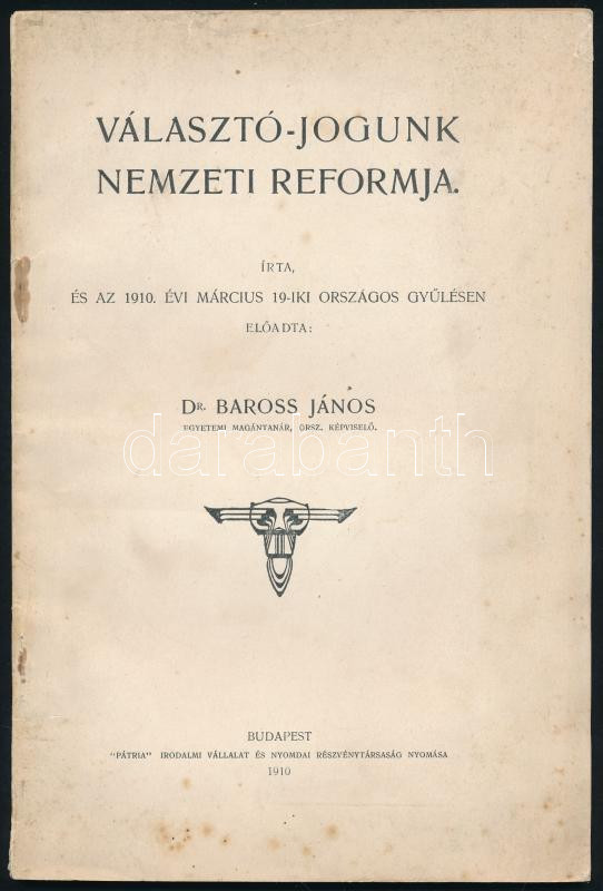 Baross János: Választójogunk nemzeti reformja. Bp., 1910., "Pátri... https://www.darabanth.com/de/428-Fernauktion/428.0/Bucher/Bucher-Jura~1000008/Baross-Janos-Valasztojogunk-nemzeti-reformja-Bp-1910-Patria-69plus1-p-Kiadoi-kisse-folt~II2743584