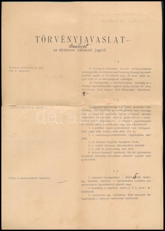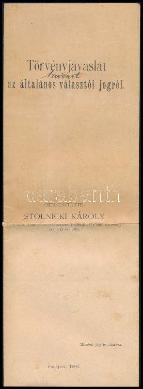 Beschreibung: Baross János: Választójogunk nemzeti reformja. Bp., 1910., "Pátria", 69+1 p. Kiadói kissé foltos papírkötés. + 1904 Törvényjavaslat az általános választói jogról. Szerk.: Stolnicki Károly. Bp., 1904, Schmelcz Izidor-ny., szakadt, rajta bejegyzésekkel.