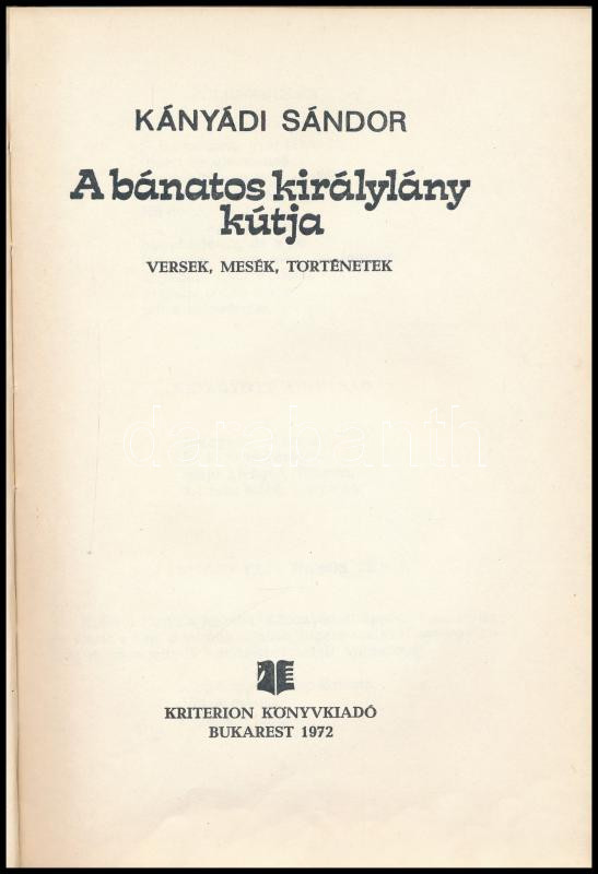 Kányádi Sándor: A bánatos királylány kútja. Bukarest, 1972, Kriterion.... https://www.darabanth.com/de/428-Fernauktion/428.0/Bucher/Bucher-Marchen~1000025/Kanyadi-Sandor-A-banatos-kiralylany-kutja-Bukarest-1972-Kriterion-Kiadoi-felvaszon-kC3~II2740135
