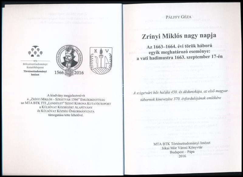 Pálffy Géza: Zrínyi Miklós nagy napja. Az 1663-1664. évi török háború egyik meghatározó eseménye: a vati hadimustra 1663. szeptember 17-én. Bp.-Pápa, 2016, Jókai Mór Városi Könyvtár. Kiadói papírkötés, jó állapotban.