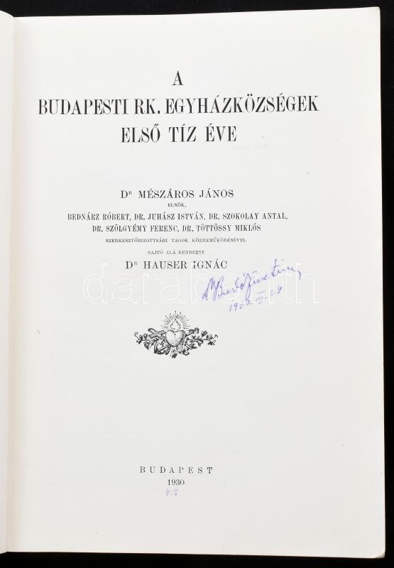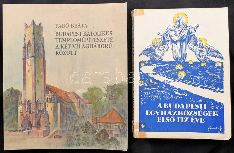 A budapesti rk. egyházközségek első tíz éve. Sajtó alá rendezte: Dr. Hauser Ignác. Bp., 1930, Budapesti Rk. Egyházközségek Központi Tanácsa (Pallas-ny.), 254 p. Fekete-fehér fotókkal illusztrálva. A borító Jaschik Álmos munkája. Kiadói papírkötés, kissé sérült borítóval és gerinccel. A címlapon Dr. Budó Jusztin (1884-1943) történész, Budapest főlevéltárosa saját kezű aláírásával. + Fabó Beáta: Budapest katolikus templomépítészete a két világháború között. Bp., 2021, Budapest Főváros Levéltára. Gazdag képanyaggal illusztrált. Kiadói papírkötés, jó állapotban.