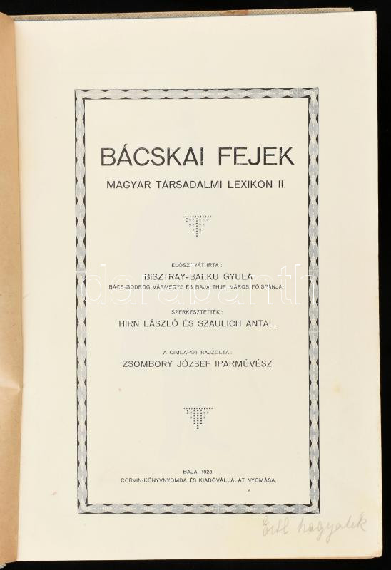 Bácskai fejek. Magyar társadalmi lexikon II. Szerk.: Hirn László és Szaulich Antal. Az előszót írta: Bisztray-Balku Gyula. Baja, 1928, Corvin-ny. Fekete-fehér fotókkal gazdagon illusztrált. A borító Zsombory József munkája. Kiadói egészvászon-kötés, kissé foltos, koszos, a könyvtesttől elváló borítóval.
