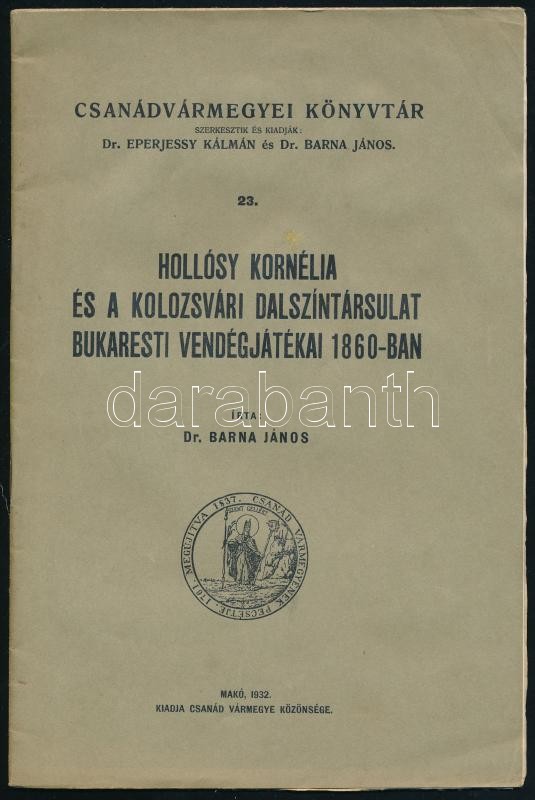 Barna János: Hollósy Kornélia és a kolozsvári dalszíntársulat bukaresti vendégjátékai 1860-ban. Csanádvármegyei Könyvtár. 22. Makó,1932., Csanád Vármegye Közönsége, (Makói Könyvnyomda), 29+1 p. Kiadói papírkötés.