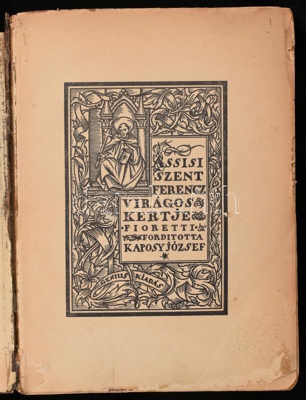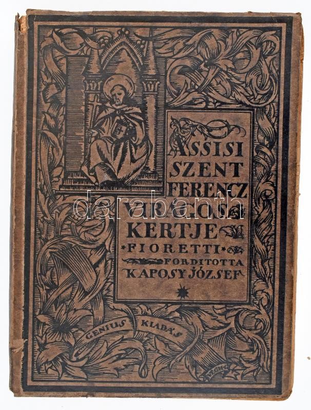 Assisi Szent Ferenc virágos kertje. (Fioretti). Ford.: Kaposy József. Bp., 1921, Genius, XXXIX+348 p. Oldalszámozáson belül 18 egészoldalas, fametszetű illusztrációval; a borító és az illusztrációk Végh Gusztáv munkái. Kiadói papírkötés, sérült borítóval és gerinccel, helyenként sérült, foltos lapszélekkel, az utolsó lap (záródísz) hiányzik.