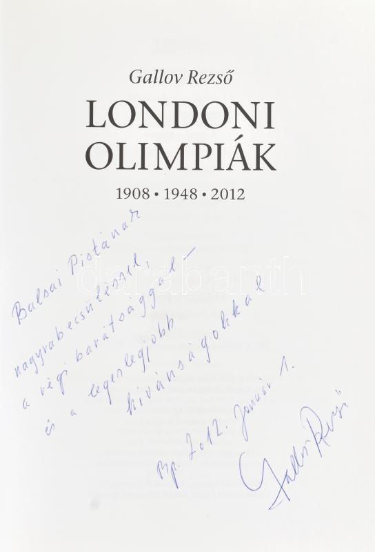 Gallov Rezső: Londoni olimpiák 1908,1948,2012. A szerző, Gallov Rezső (1936 - ) edző, újságíró, sportvezető által Balsai István (1947-2020) ügyvéd, politikus, országgyűlési képviselő, 1990 és 1994 között igazságügy-miniszter, 2011. szeptember 11-től élete végéig az Alkotmánybíróság tagja részére DEDIKÁLT példány! Bp., 2011, Kossuth. Kiadói papírkötésben.