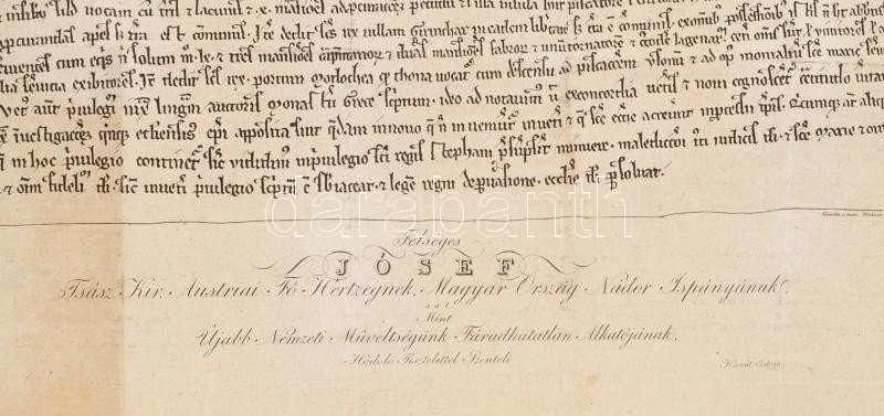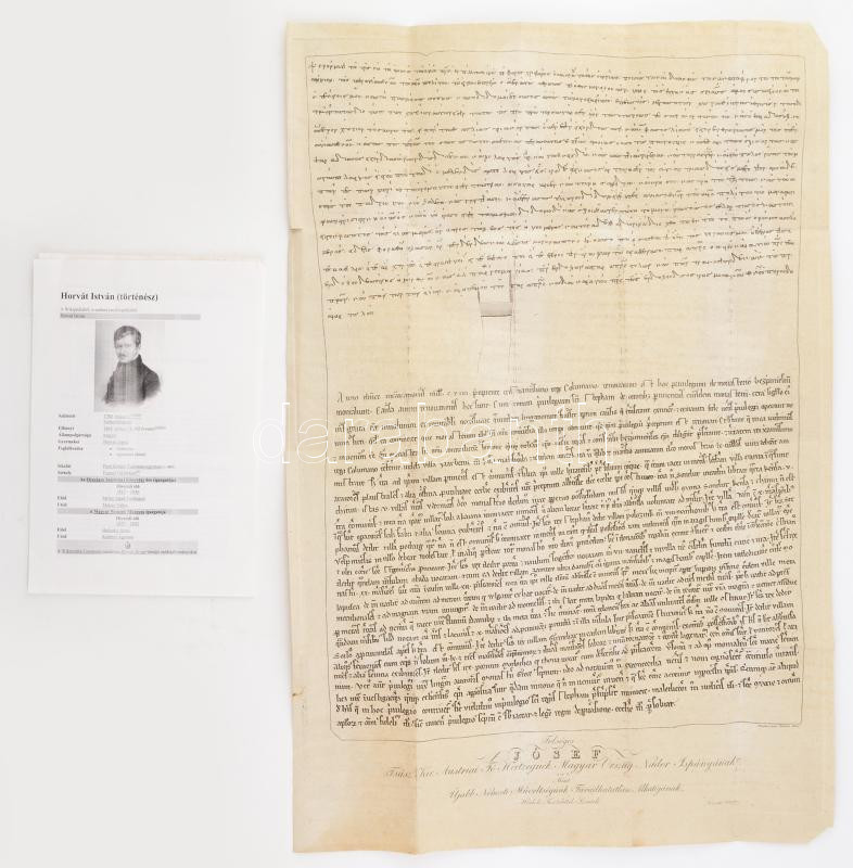 Beschreibung: cca 1840 Könyves Kálmán oklevelének rézmetszetű facsimiléje József Nádor tiszteletére. Készítettet Horvát István történész .74x50 cm