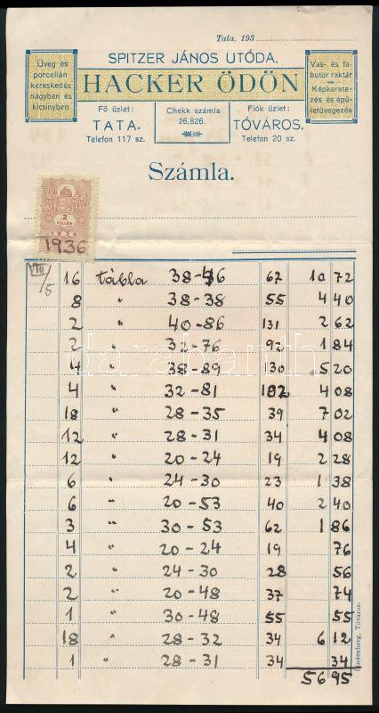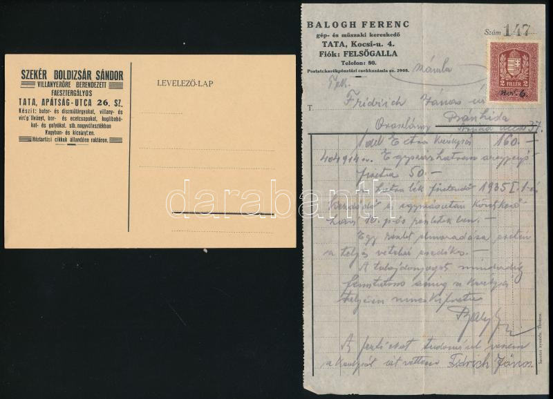 1936 Tata, Szekér Boldizsár Sándor faesztergályos, Balogh Ferenc gép- és műszaki kereskedő, Hacker Ödön üveg és porcelánkereskedő fejléces számlája és levelezőlapja