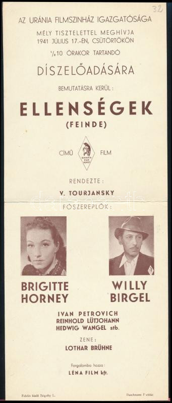 1941 Bp., Uránia Filmszínház, az Ellenségek (Feinde) c. német film (re... https://www.darabanth.com/de/428-Fernauktion/428.0/Kunst-Dokumente-andere-Sammelgebiete/Drucksachen~1000004/1941-Bp-Urania-Filmszinhaz-az-Ellensegek-Feinde-c-nemet-film-rendezte-Viktor-Tourjansky~II2746636