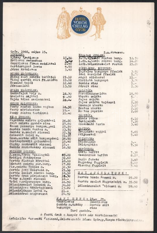 1968 Győr, Hotel Vörös Csillag étlapja, a borító kissé sérült https://www.darabanth.com/de/428-Fernauktion/428.0/Kunst-Dokumente-andere-Sammelgebiete/Drucksachen~1000004/1968-Gyor-Hotel-Voros-Csillag-etlapja-a-borito-kisse-serult~II2738631