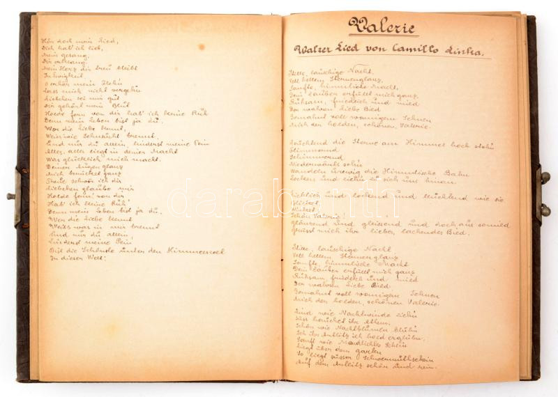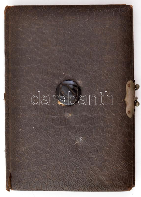 1896 Régi emlékkönyv, benne számos magyar és német nyelvű bejegyzéssel (versek, népdalok, stb.), fémkapcsos, vászonborítású füzetben, helyenként sérült / kijáró lapokkal