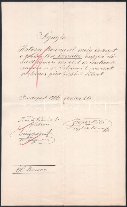 1906 Bp, Szent István Plébánia kasszájából felvett 60 korona nyugtája, aláírásokkal