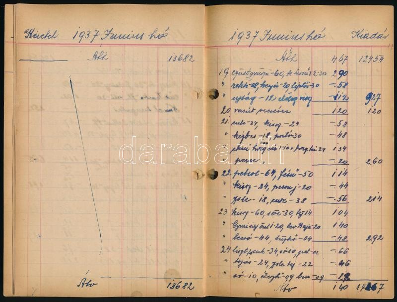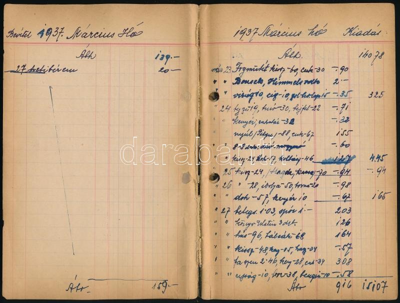 1937-1938 Háztartás pénzügyi nyilvántartása, bevételek és kiadások, kézzel írt füzet
