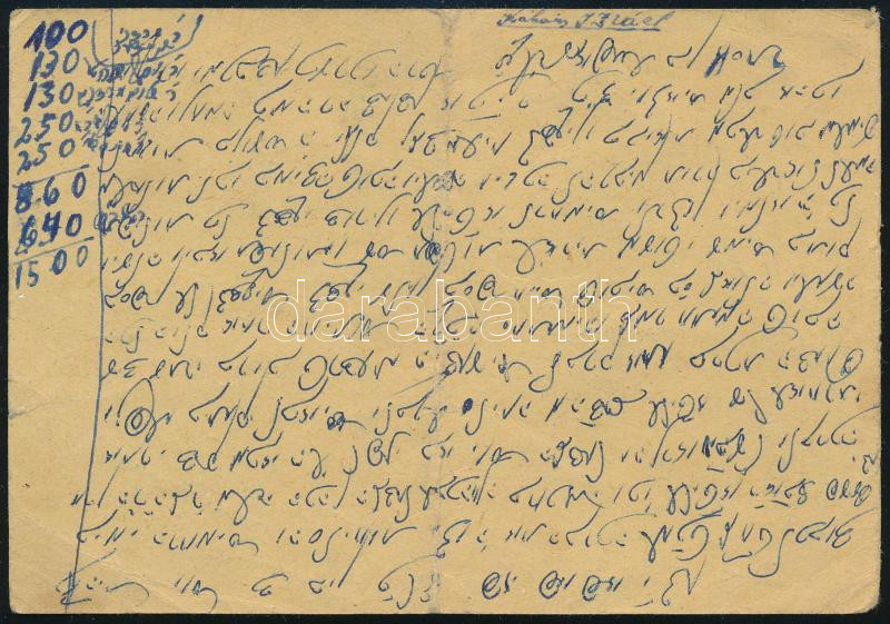 1960 Héber nyelvű levelzőlap https://www.darabanth.com/de/428-Fernauktion/428.0/Kunst-Dokumente-andere-Sammelgebiete/Judaica~500025/1960-Heber-nyelvu-levelzolap~II2742428