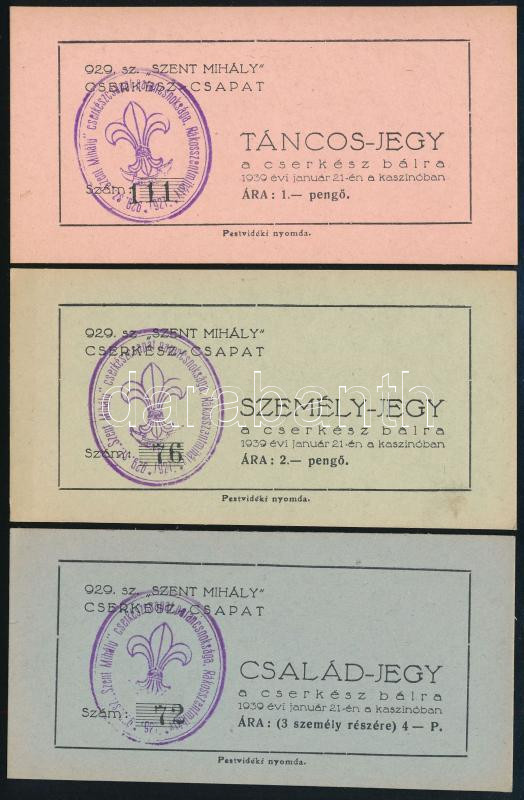 Beschreibung: 1939 3 db cserkész bálra szóló számozott jegy, 929. sz. "Szent Mihály" cserkészcsapat parancsnoksága, Rákosszentmihály bélyegzőjével