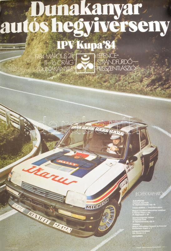 1984 Dunakanyar autós hegyiverseny plakát, ofszet, papír, hajtásnyomok... https://www.darabanth.com/de/428-Fernauktion/428.0/Kunst-Dokumente-andere-Sammelgebiete/Plakat~1000003/1984-Dunakanyar-autos-hegyiverseny-plakat-ofszet-papir-hajtasnyomokkal-feltekerve-97x67-cm~II2746274