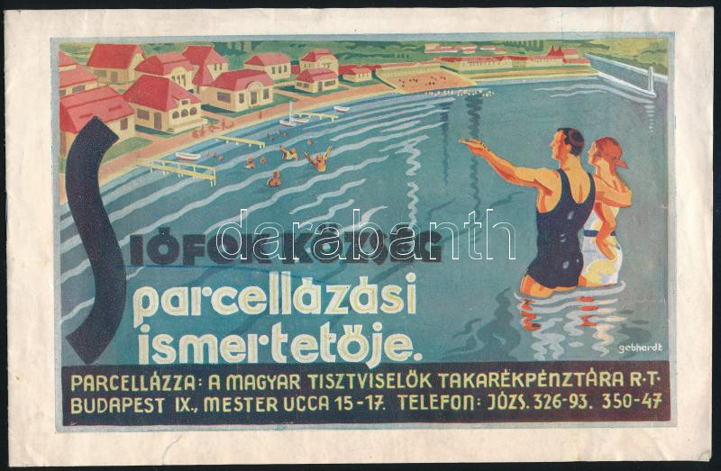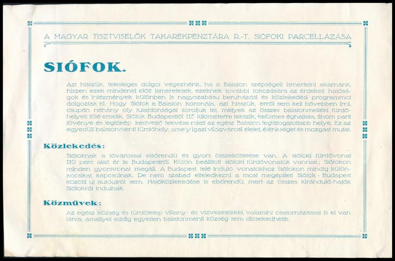 cca 1930 Siófok község parcellázási ismertetője, parcellázza a Magyar Tisztviselők Takarékpénztára Rt., dekoratív címlapú (szign. Gönczi-Gebhardt) füzet, 8p