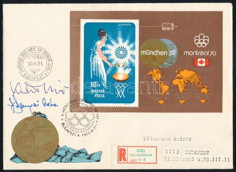 Beschreibung: 1973 Kulcsár Győző (1940-2018) és Fenyvesi Csaba (1943-2015) többszörös olimpiai és világbajnok vívók autográf aláírásai Olimpia FDC-n
