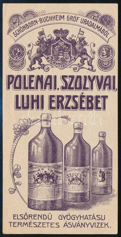 Polenai, Szolyvai, Luhi Erzsébet gyógyhatású természetes ásványvíz szá... https://www.darabanth.com/de/428-Fernauktion/428.0/Kunst-Dokumente-andere-Sammelgebiete/Werbungen~500022/Polenai-Szolyvai-Luhi-Erzsebet-gyogyhatasu-termeszetes-asvanyviz-szamolocedula~II2742063