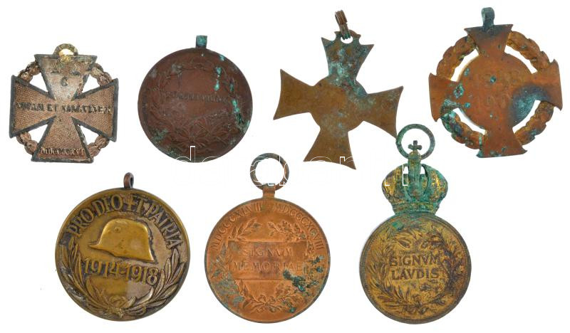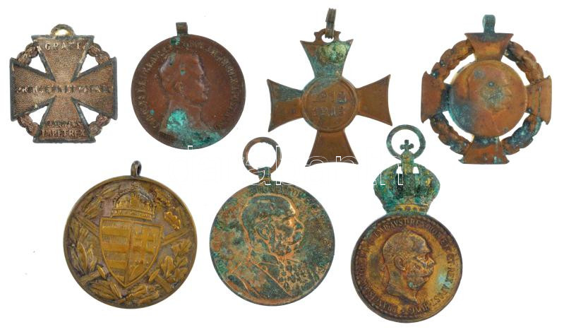 1890. "Bronz Katonai Érdemérem" aranyozott bronz kitüntetés mellszalag nélkül + 1898. "Jubileumi Emlékérem a Fegyveres Erő Számára / Signum memoriae (AVSTR)" bronz kitüntetés mellszalag nélkül + 1908. "Jubileumi Kereszt" aranyozott bronz kitüntetés mellszalag nélkül + 1913. "Mozgósítási Kereszt / 1912-1913-as Emlékkereszt" bronz kitüntetés mellszalag nélkül + 1916. "Károly-csapatkereszt" Zn kitüntetés mellszalag nélkül + 1917. "Károly Bronz Vitézségi Érem" bronz kitüntetés mellszalag nélkül. Szign.: Kautsch + 1929. "Magyar Háborús emlékérem kardokkal, sisakkal" ezüstözött, jelzetlen bronz kitüntetés szalag nélkül T:2-,3 patina Hungary 1890. "Bronze Military Merit Medal (Signum Laudis)" gold plated bronze decoration without ribbon + 1898. "Commemorative Jubilee Medal for the Armed Forces" bronze decoration without ribbon + 1908. "Diamond Jubilee Cross" gilt bronze decoration without ribbon + 1913. "Commemorative Cross, 1912-1913" bronze decoration without ribbon + 1916. "Charles Troop Cross" Zn decoration without ribbon + 1917. "Bronze Gallantry Meda" bronze decoration without ribbon. Sign.: Kautsch + 1929. "Hungarian Commemorative War Medal with swords and a helmet" silver-plated, unmarked bronze decoration without ribbon C:VF,F patina NMK 244., 249., 269., 275., 295., 310., 418.