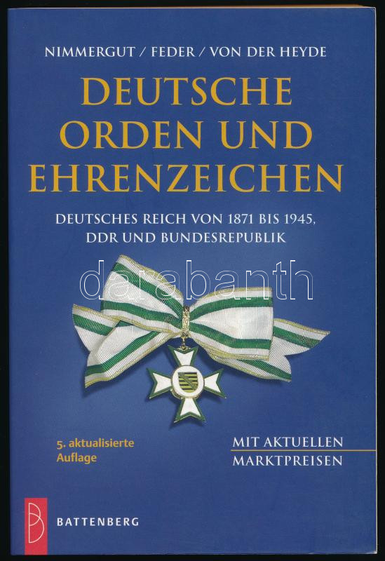 J. Nimmergut - K.H. Feder - H. von der Heyde: Deutsche Orden und Ehrenzeichen - Deutsches Reich von 1871 bis 1945, DDR und Bundesrepublik (Német rendek és kitüntetések - Német Birodalom 1871-1945, Német Demokratikus Köztársaság és Szövetségi Köztársaság). 5. kiadás. Battenberg Verlag, München, 2000. Újszerű állapotban.