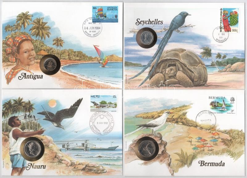12db-os érmés boríték tétel a Nemzetközösség államaiból, mind különféle és német nyelvű tájékoztatóval, benne: Nevis, Norfolk-sziget, Tristan da Cunha, Karácsony-szigetek, Grenada, Montserrat, St. Lucia, St. Kitts, Antigua, Nauru, Seychelles-szigetek, Bermuda T:1