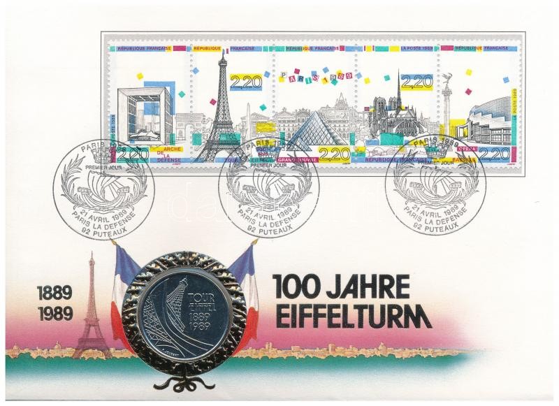 Franciaország 1989. 5Fr Cu-Ni "Eiffel-torony" fém emlékérem érmés borítékban bélyeggel, bélyegzéssel, német nyelvű leírással T:1