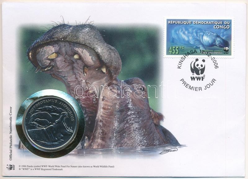 Kongói Demokratikus Köztársaság DN (1991) "A Világ Vadvédelmi Alap (WWF) 30. évfordulója - Hippopotamus Amphibius (Nílusi víziló)" kétoldalas Cu-Ni emlékérem érmés borítékban, bélyeggel és bélyegzéssel, német nyelvű ismertetővel T:1