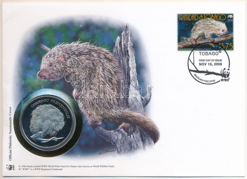 Trinidad és Tobago DN (1991) "A Világ Vadvédelmi Alap (WWF) 30. évfordulója - Coendou Prehensilis (Amazoni kúszósül)" kétoldalas fém emlékérem érmés borítékban, bélyeggel és bélyegzéssel, német nyelvű ismertetővel T:PP Trinidad and Tobago ND (1991) "30th Anniversary of the World Wildlife Fund - Coendou Prehensilis" two-sided metal commemorative medallion in envelope with stamp and cancellation, with German description C:PP