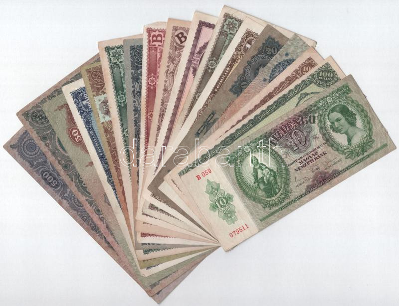 16db-os pengő bankjegy tétel, mind különféle, közte 1930. 20P T:II-III https://www.darabanth.com/de/428-Fernauktion/428.0/Numismatik/Ungarische-Banknoten~3000007/16db-os-pengo-bankjegy-tetel-mind-kulonfele-kozte-1930-20P-TII-III~II2746951