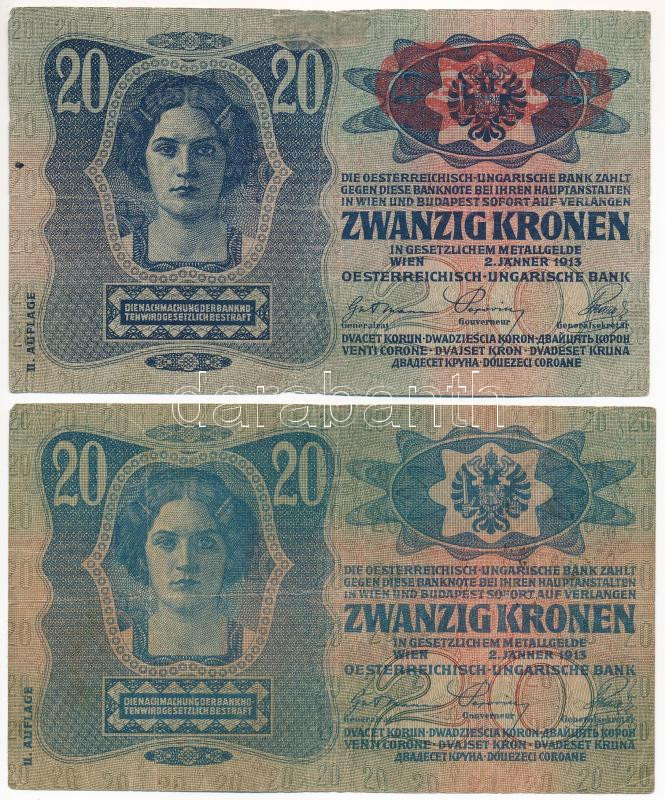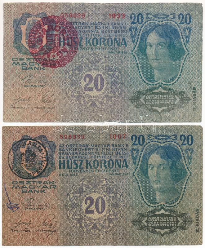 Hungary 1913. 20 Korona 2nd issue, with red "MAGYARORSZÁG" overprint + 1913. 20 Korona 2nd issue, with black "ROMANIA TIMBRU SPECIAL" overprint C:F