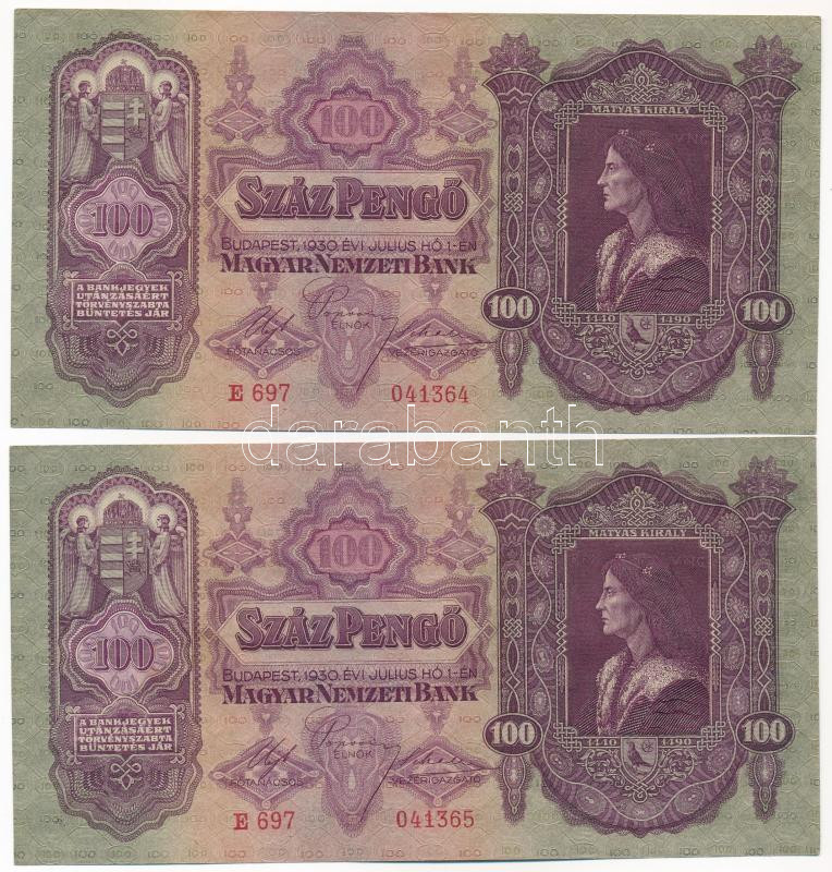 Beschreibung: 1930. 100P (2x) sorszámkövetők "E 697 041364 - 041365" T:II