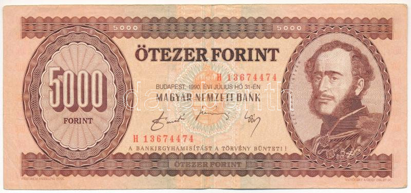 1990. 5000Ft "H 13674474" T:III Hungary 1990. 5000 Forint &q... https://www.darabanth.com/de/428-Fernauktion/428.0/Numismatik/Ungarische-Banknoten~3000007/1990-5000Ft-H-13674474-TIII-Hungary-1990-5000-Forint-H-13674474-CF-Adamo-F49~II2708532