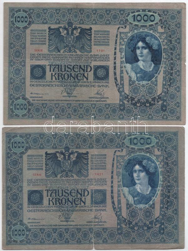 Ausztria 1919. (1902) 1000K (2x) függőleges "DEUTSCHÖSTERREICH" felülbélyegzéssel, mindkét oldal német T:III kis szakadás Austria 1919. (1902) 1000 Kronen (2x) with vertical "DEUTSCHÖSTERREICH" overprint, both sides in german C:F small tear Krause P#58